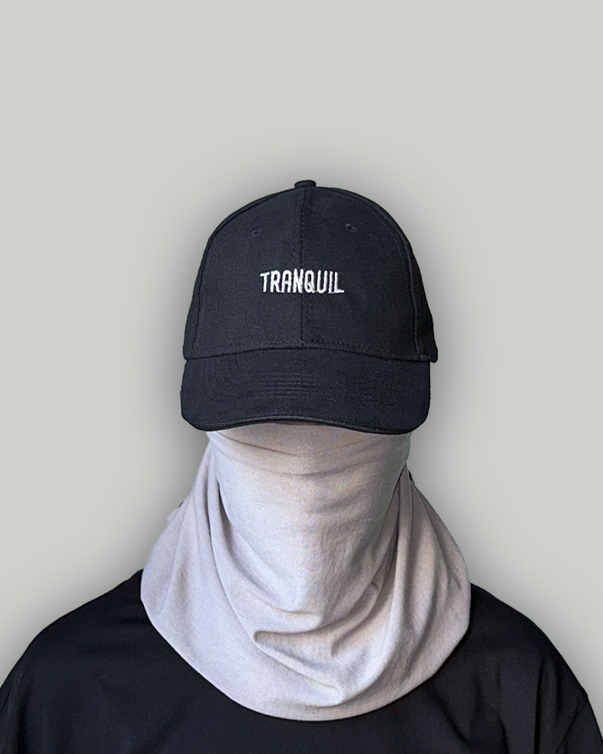 A black cap, with "Tranquil" embroidered on the front.