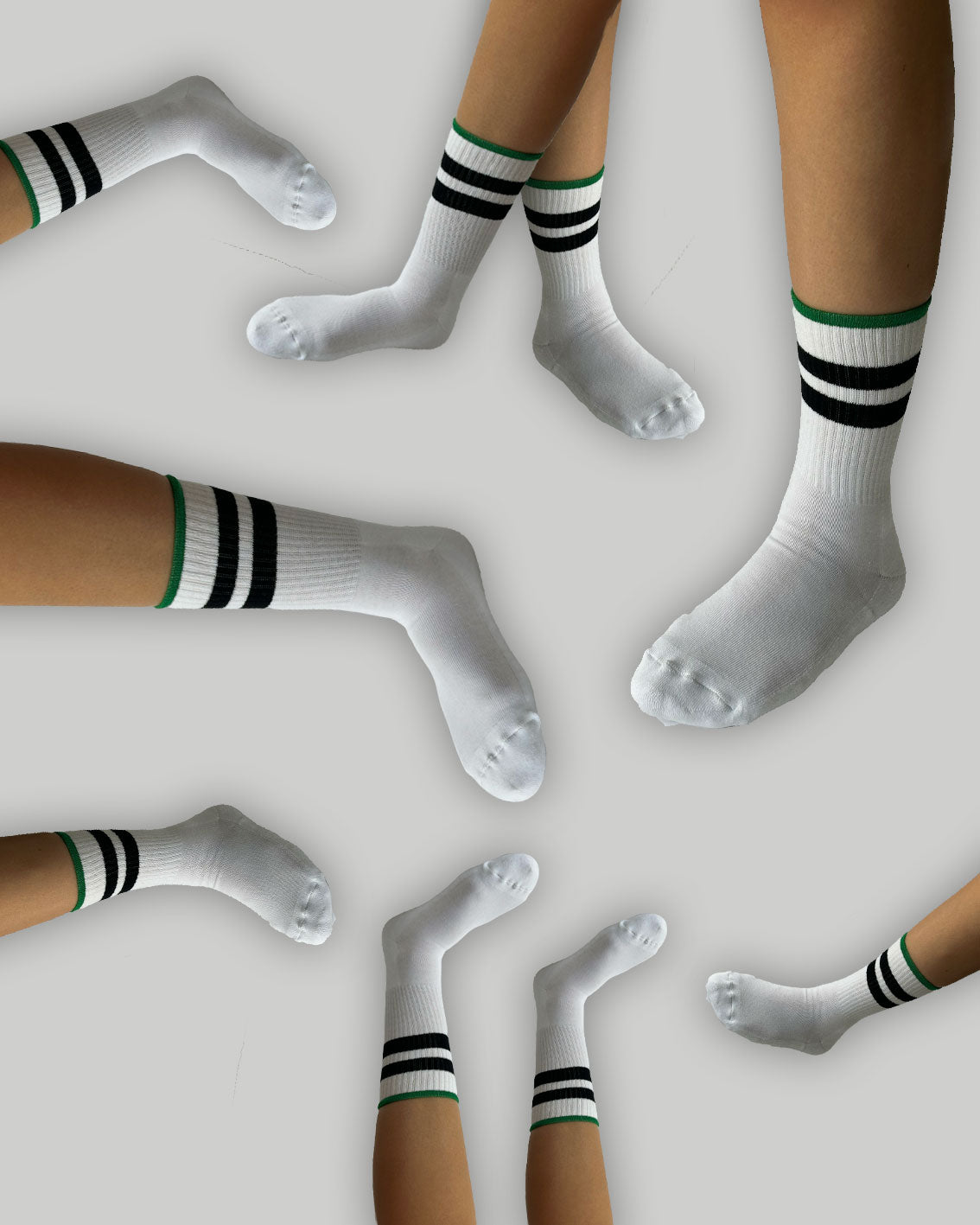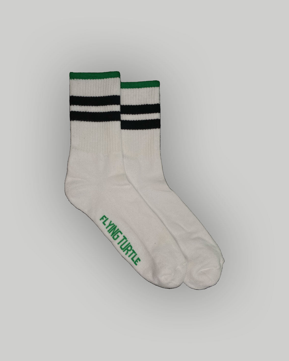 A sports sock, featuring two stripes and a subtle touch of green detail.